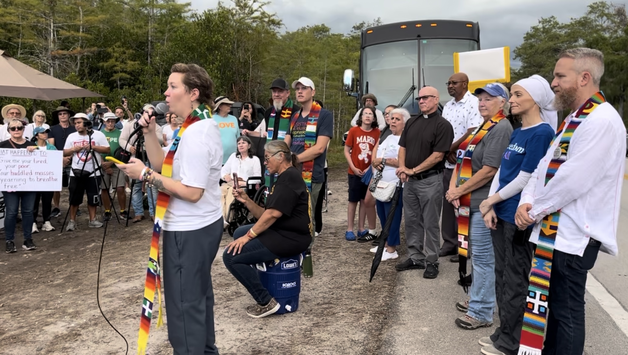 «Rechazamos el nacionalismo cristiano blanco… Aunque nuestra lucha actual es contra las administraciones de Trump y De Santis, también debemos reconocer que este centro de detención es la culminación de más de 100 años de política exterior estadounidense. Trump ha dado rienda suelta a ICE, la cual se fortaleció y creció tanto bajo la administración de Biden como la de Obama. ¡Debemos buscar soluciones! ¡Debemos aspirar a soluciones más ambiciosas que no se queden cortas, hasta lograr la liberación de todas las personas! Puede que no sepamos cómo solucionarlo, pero averigüémoslo juntas y juntos».